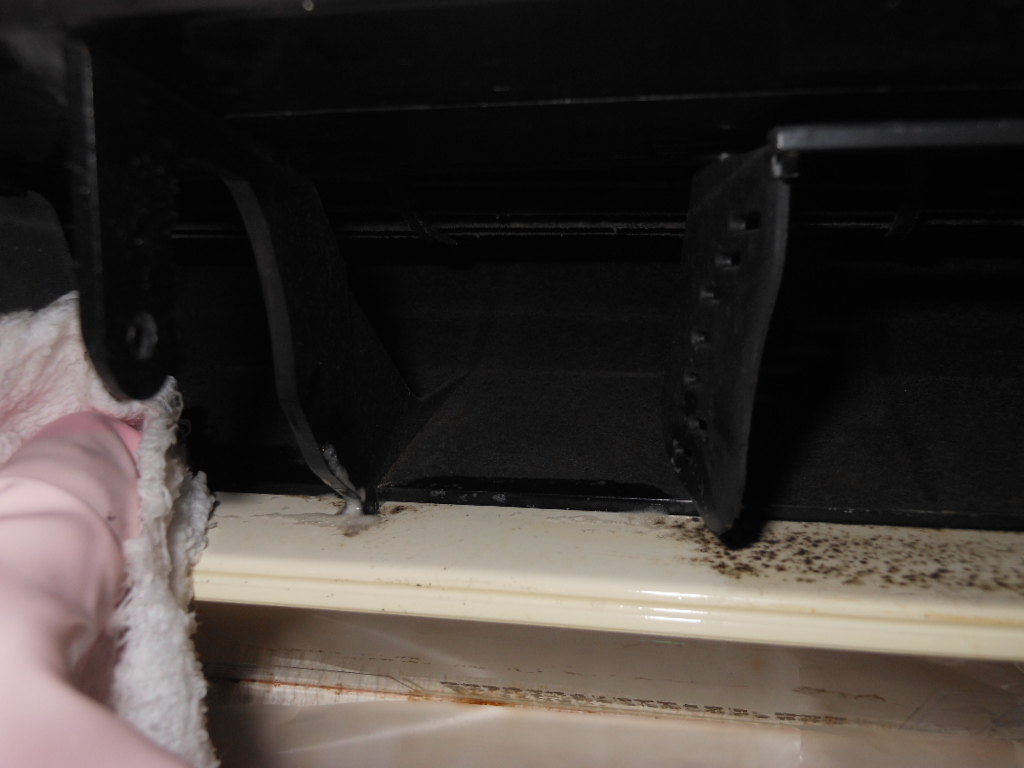 後は手の届く範囲で、こびりついた汚れを拭き掃除します。くれぐれも内部にはクリーナー噴霧はしないようにしながら、ての届く範囲は洗剤でカビ汚れを拭きとります。