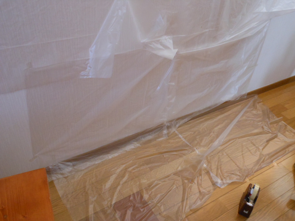 そして、今回は市販のエアコンクリーナー(スプレー)を使いますんので、念の為、壁床を養生します。