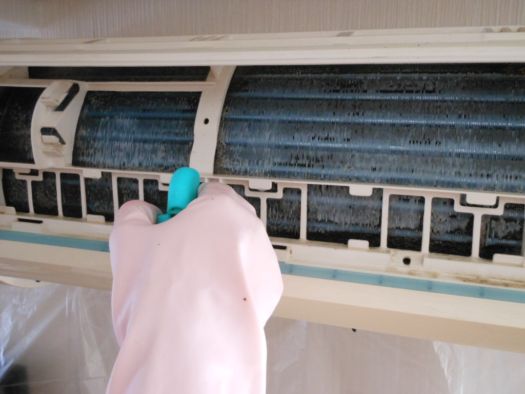 市販のエアコンクリーナーは高圧力スプレータイプが多く、噴霧される洗浄剤で、ホコリやカビを洗い流していきます。