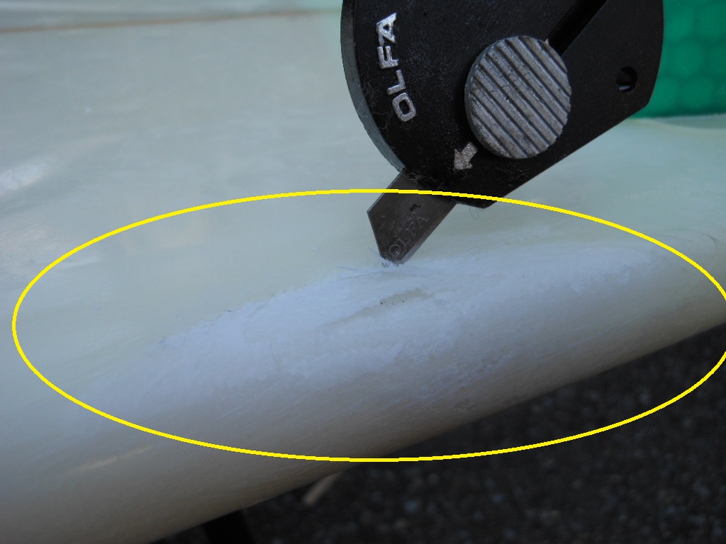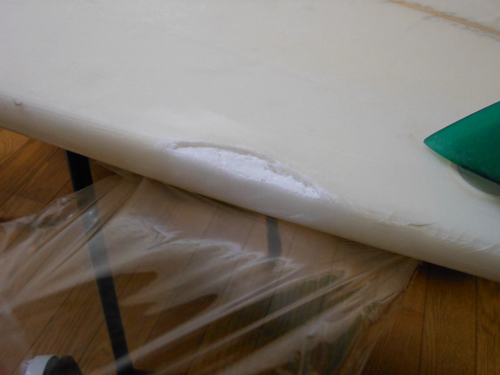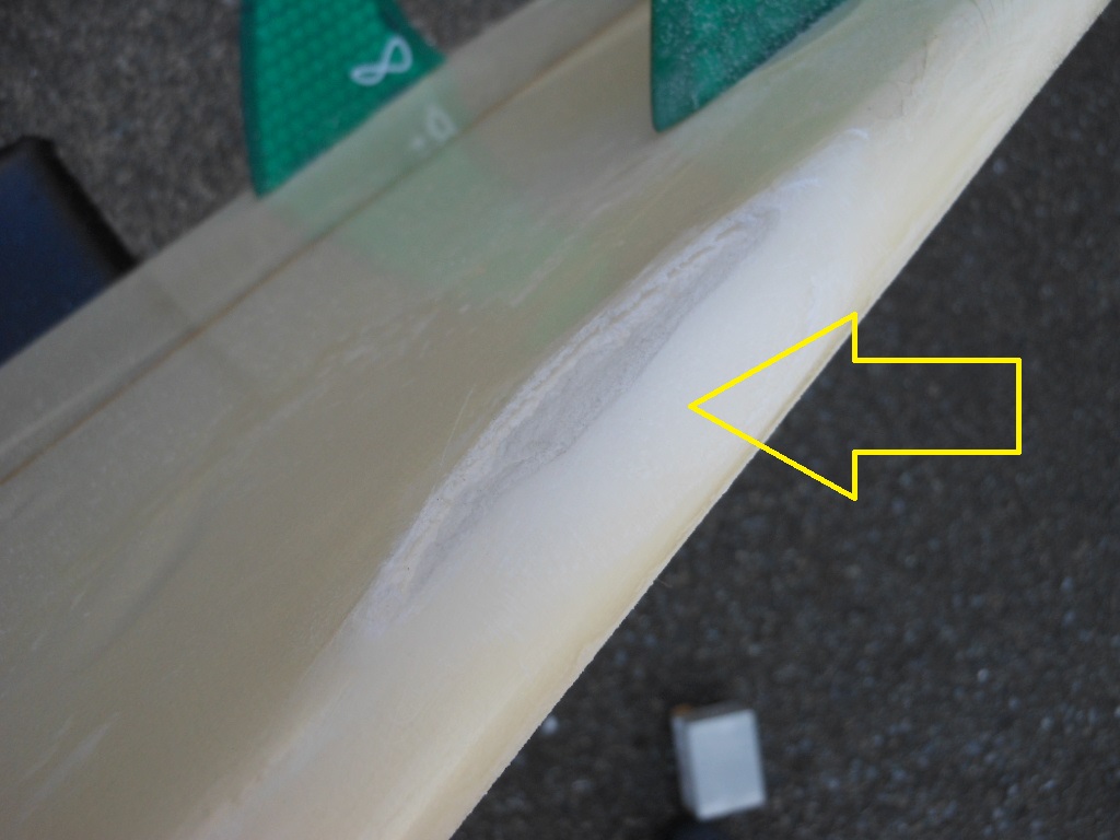 フォームが見えるくらいのキズで 長さは10cm弱、ショップにリペアにだせば数千円~1万円は覚悟、かつ明日の波はお預け・・・。