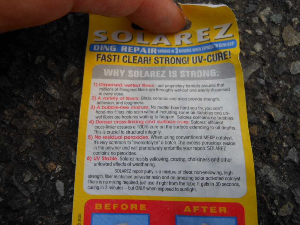 ソーラーレズ【SOLAREZ]】はガラスクロスファイバーが配合された紫外線で硬化する オールインワンの簡易修理材。
